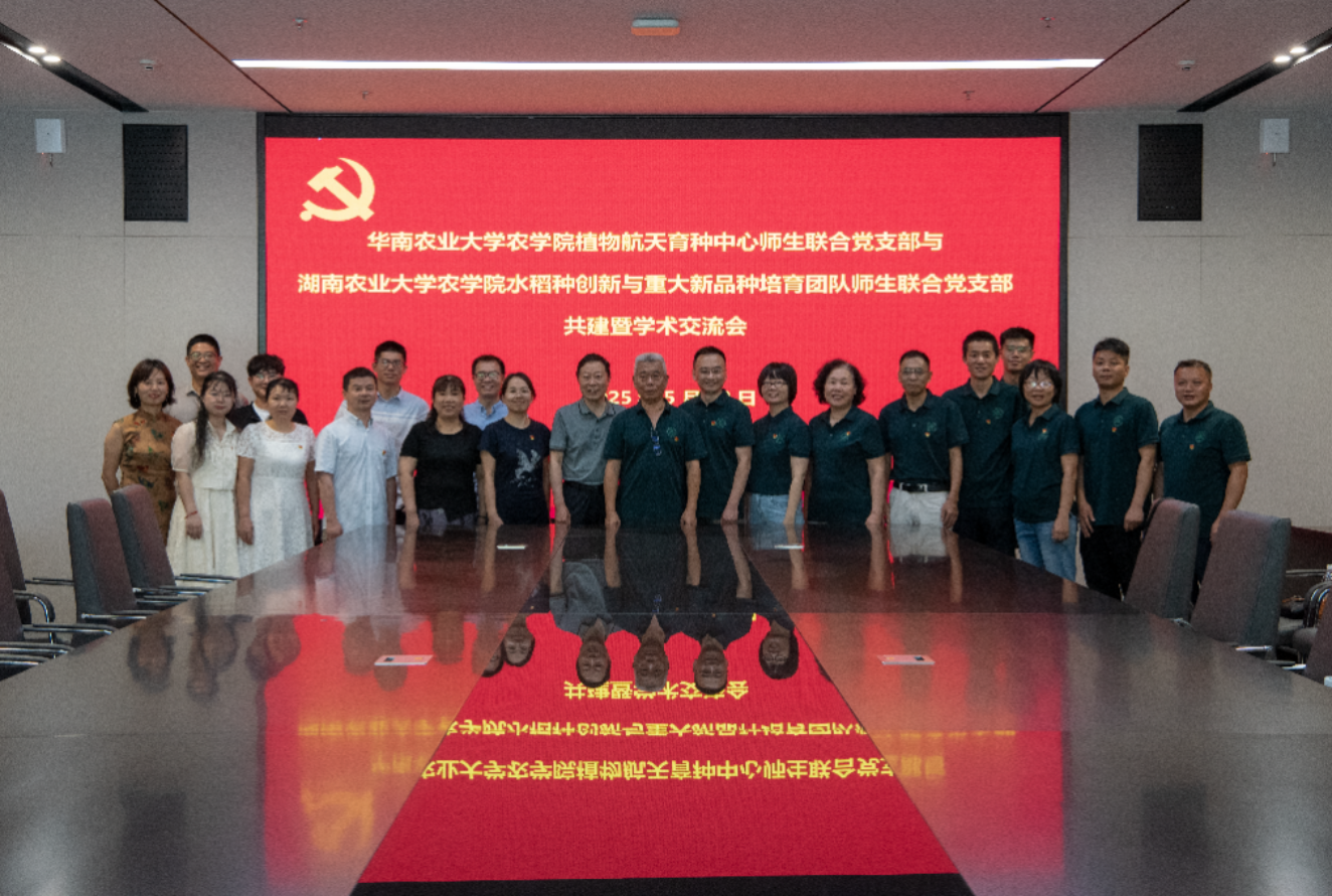 本网讯(农学院 陈秋红)5月19日,农学院水稻种质创新与重大新品种培育团队师生联合党支部与华南农业大学农学院植物航天育种中心师生联合党支部在岳麓山实验室举行支部共建暨学术交流活动。华南农业大学原副校长陈志强,植物航天育种中心师生联合党支部书记、中心主任郭涛,植物航天育种中心副主任王慧一行;我校农学院党委书记刘敏、院长吴俊、原党委书记周其林、副院长吴德志、水稻种质创新与重大新品种培育团队负责人邓化冰、师生联合党支部书记陈秋红等师生党员参加。