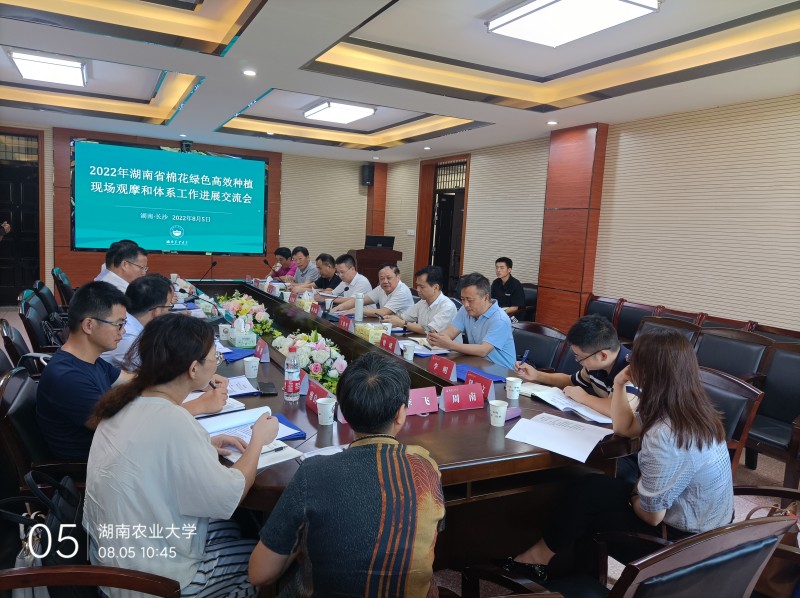 2022年8月4日-5日,由湖南省农业农村厅和湖南省棉花产业技术体系主办,我校承办的2022年湖南省棉花绿色高效种植现场观摩和体系工作进展交流会在我校召开。省农业农村厅种植业处丁伟平二级调研员、科技处肖青松副处长、种植业处吴若云研究员、湖南省棉科所曾球所长、省棉花产业技术体系首席专家赵瑞元研究员以及体系全体岗位专家、试验站站长等20余人参加了会议。