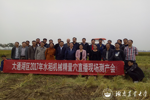 我校水稻栽培团队与罗锡文院士团队密切合作,2016年实现了在日均温度高、昼夜温差小的湖区小面积单丘亩产840kg产量突破,得到了罗院士的高度肯定;今年在气候条件不利的情况下,百亩连片示范平均产量超过750kg,高产丘块超过800kg,实现了湖区水稻产量与生产方式的跨越,表明水稻直播采用精量机械穴直播与同步封闭除草的方式,不仅省工省力,克服倒伏,而且可以实现规模化高产高效,是一种节本高效的水稻种植模式。