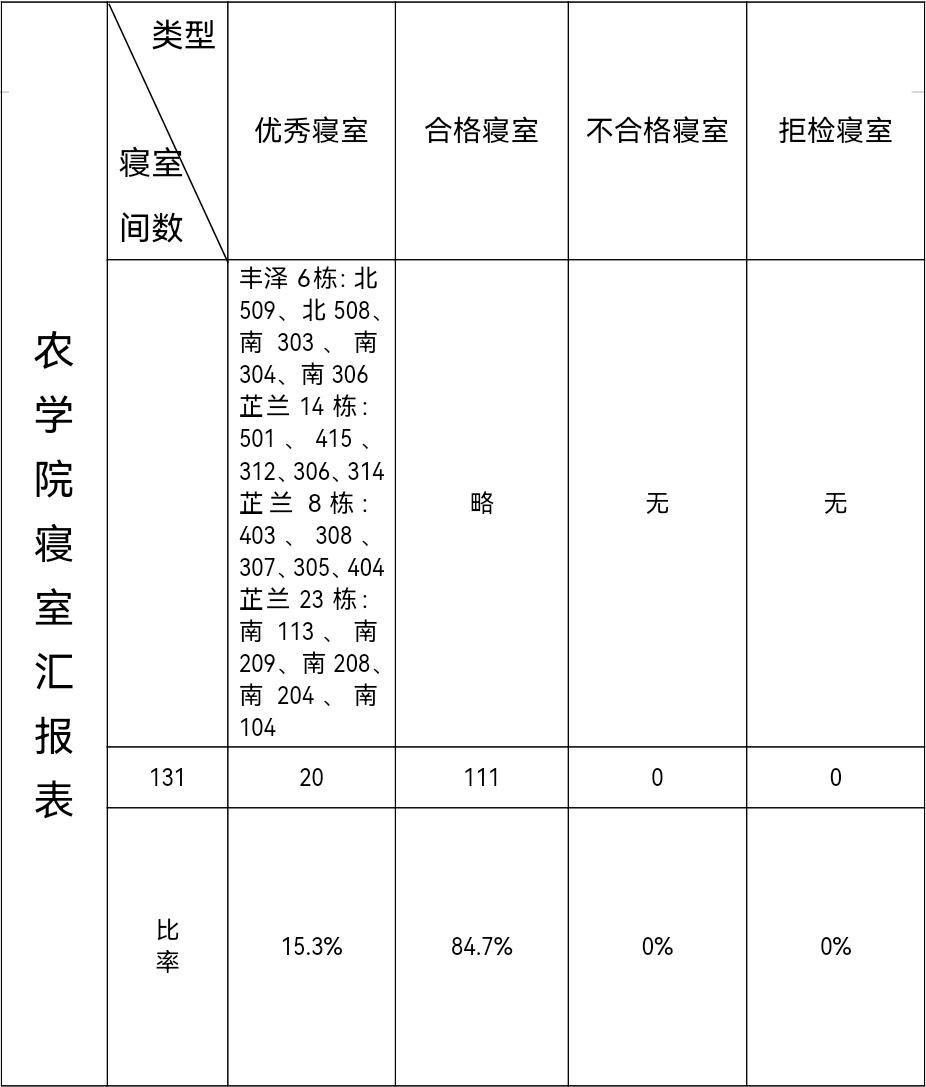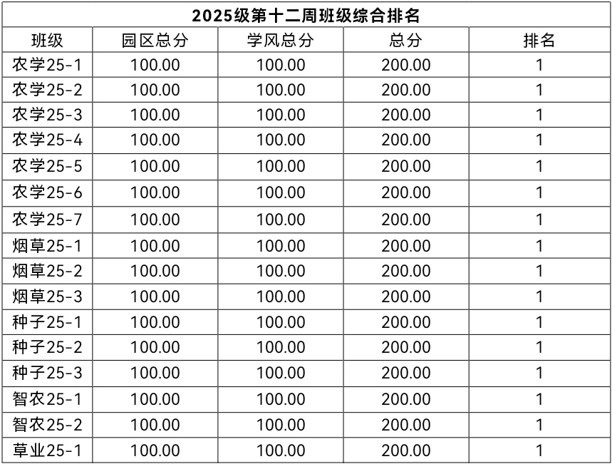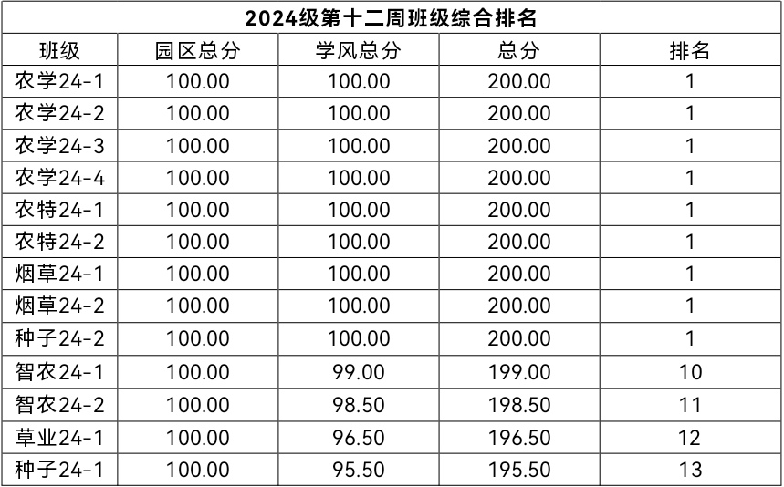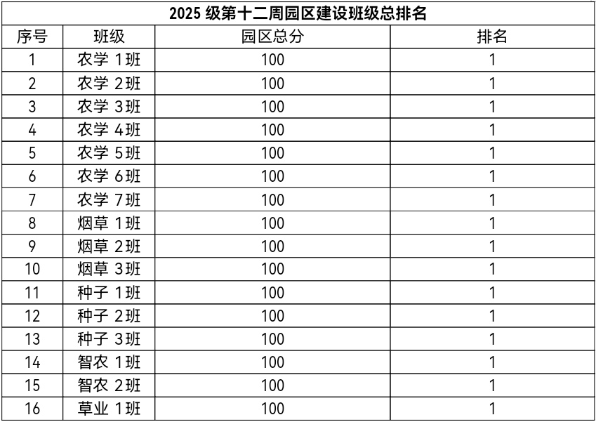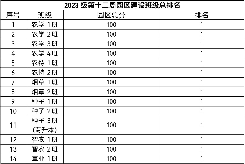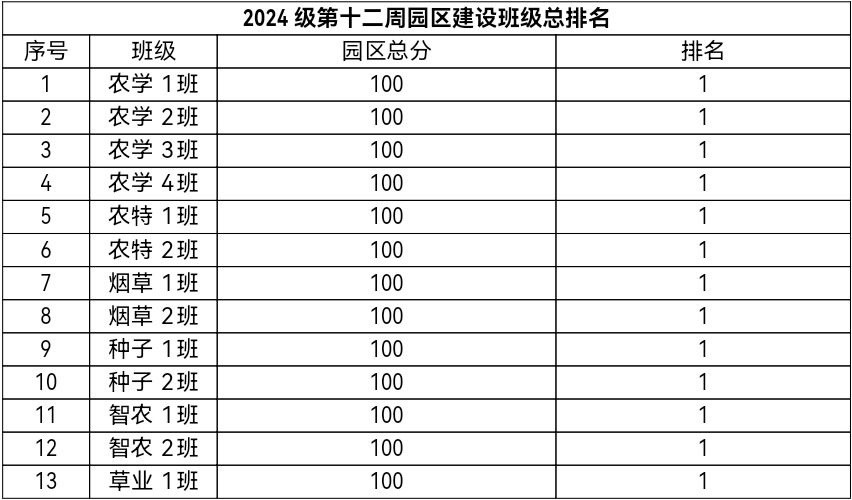 第十二周各年级均表现优秀,卫生情况良好,希望继续保持,同时也希望各年级保持优良作风,切实加强学院园区建设,共创美丽校园。