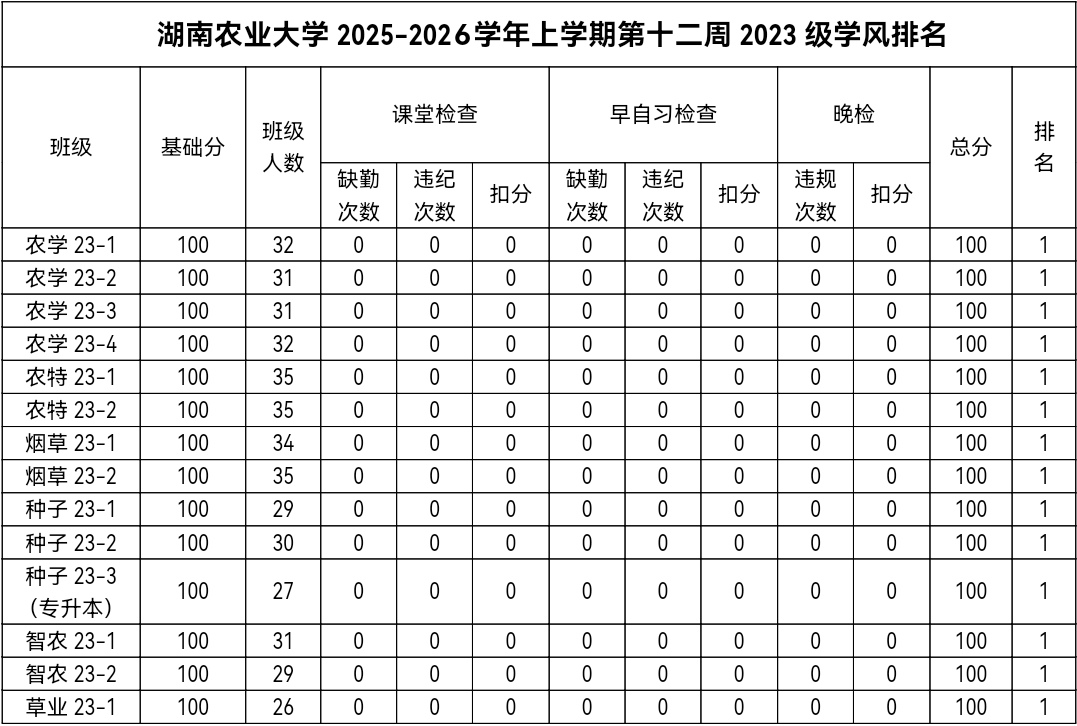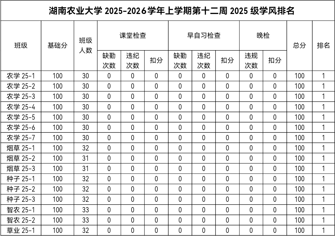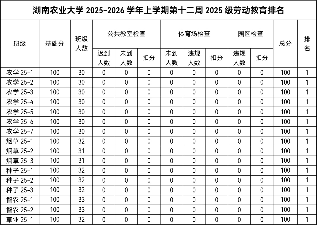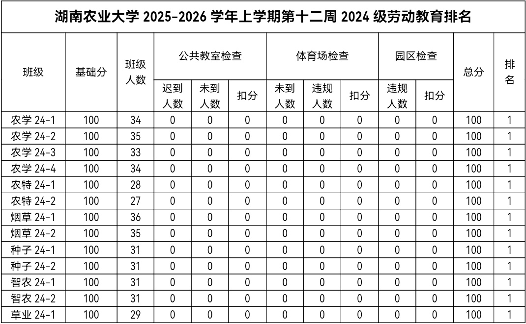 第十二周各年级均表现优秀,卫生情况良好,希望继续保持,同时也希望各年级保持优良作风,切实加强学院园区建设,共创美丽校园。