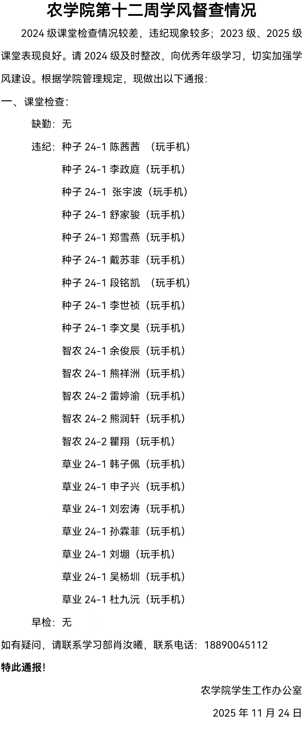 2024级课堂检查情况较差,存在违纪现象,2023级和2025级课堂情况较好,继续保持优良作风。希望2024级能及时改正,切实加强学风建设。