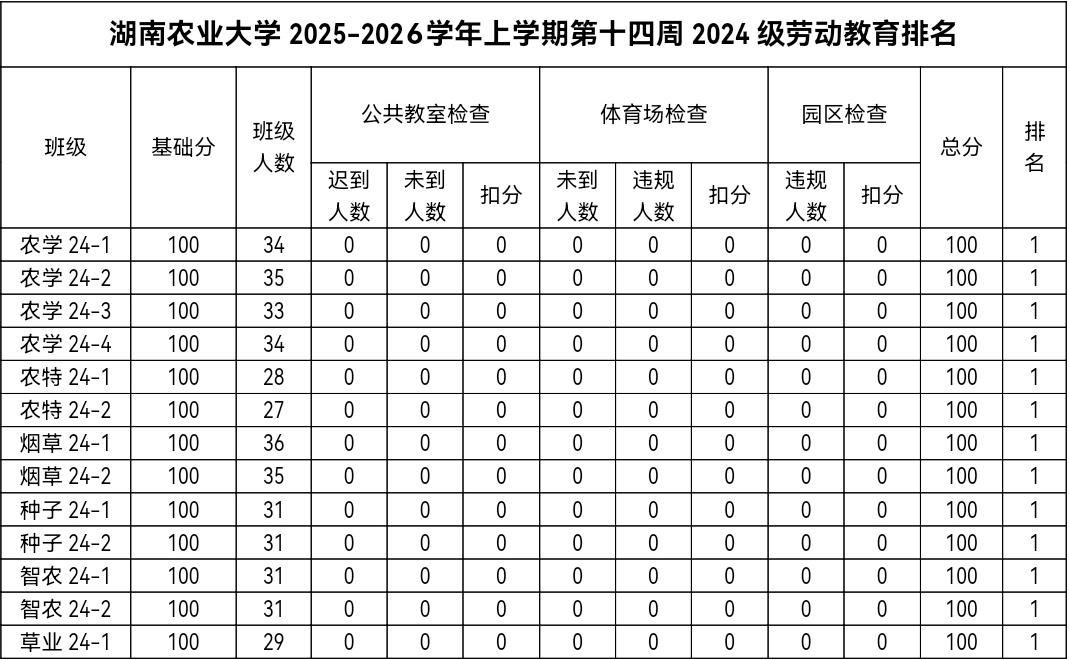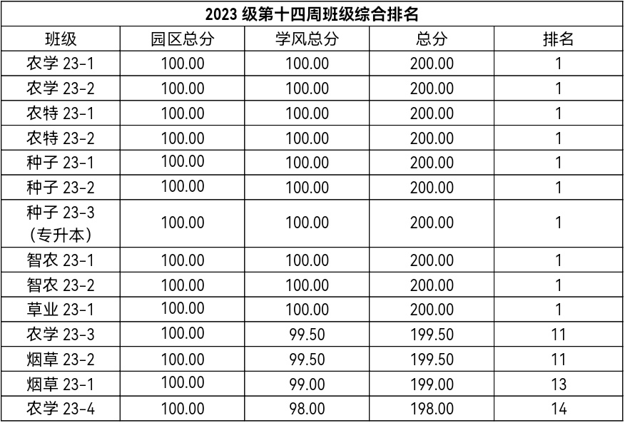 第十四周各年级均表现优秀,卫生情况良好,希望继续保持,同时也希望各年级保持优良作风,切实加强学院园区建设,共创美丽校园。