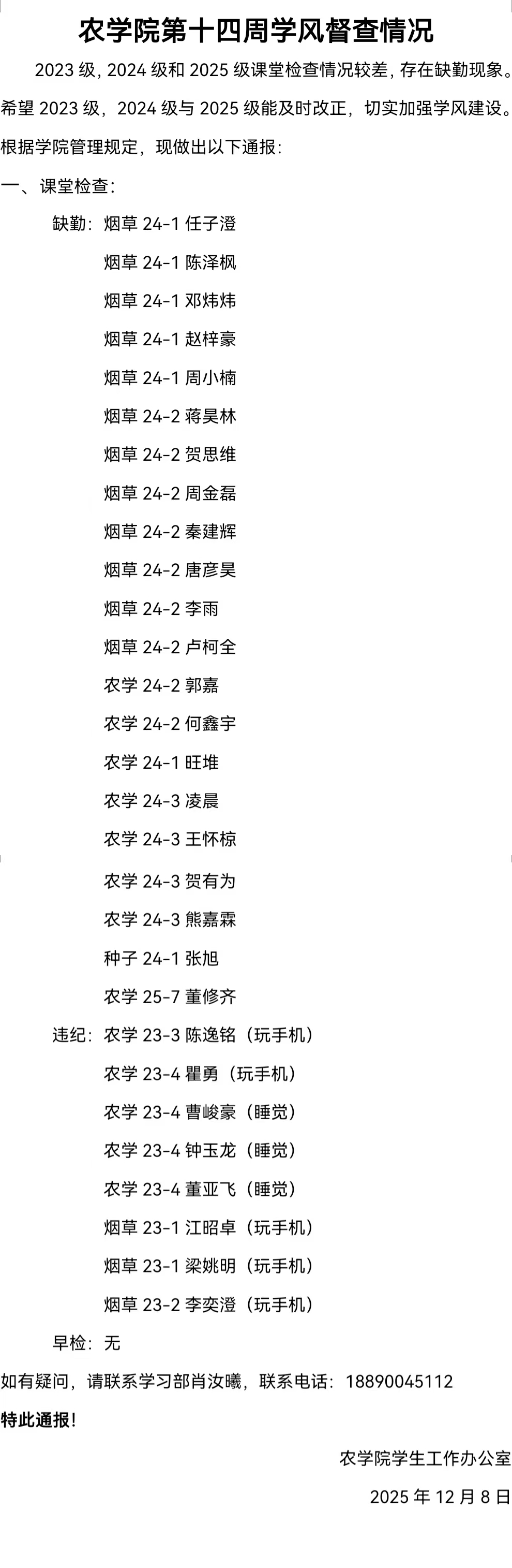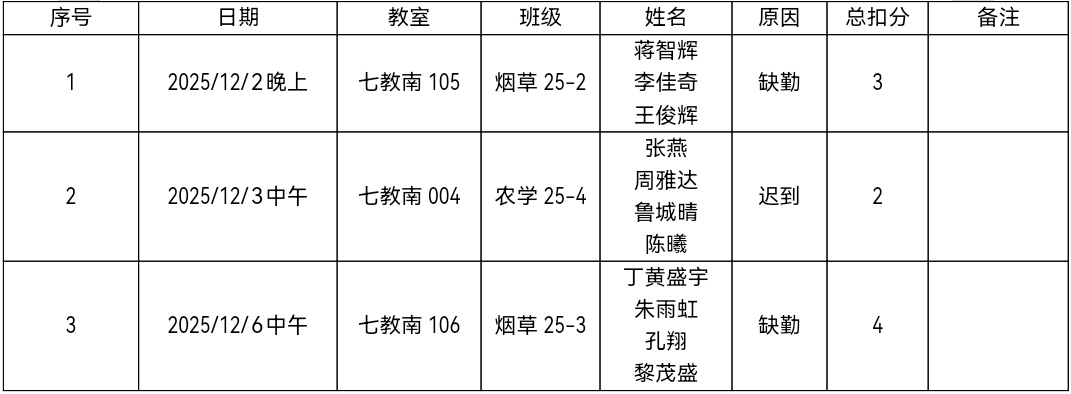 2023级、2024级和2025级课堂检查情况较差,存在违纪和缺勤现象。希望2023级、2024级与2025级能及时改正,切实加强学风建设。