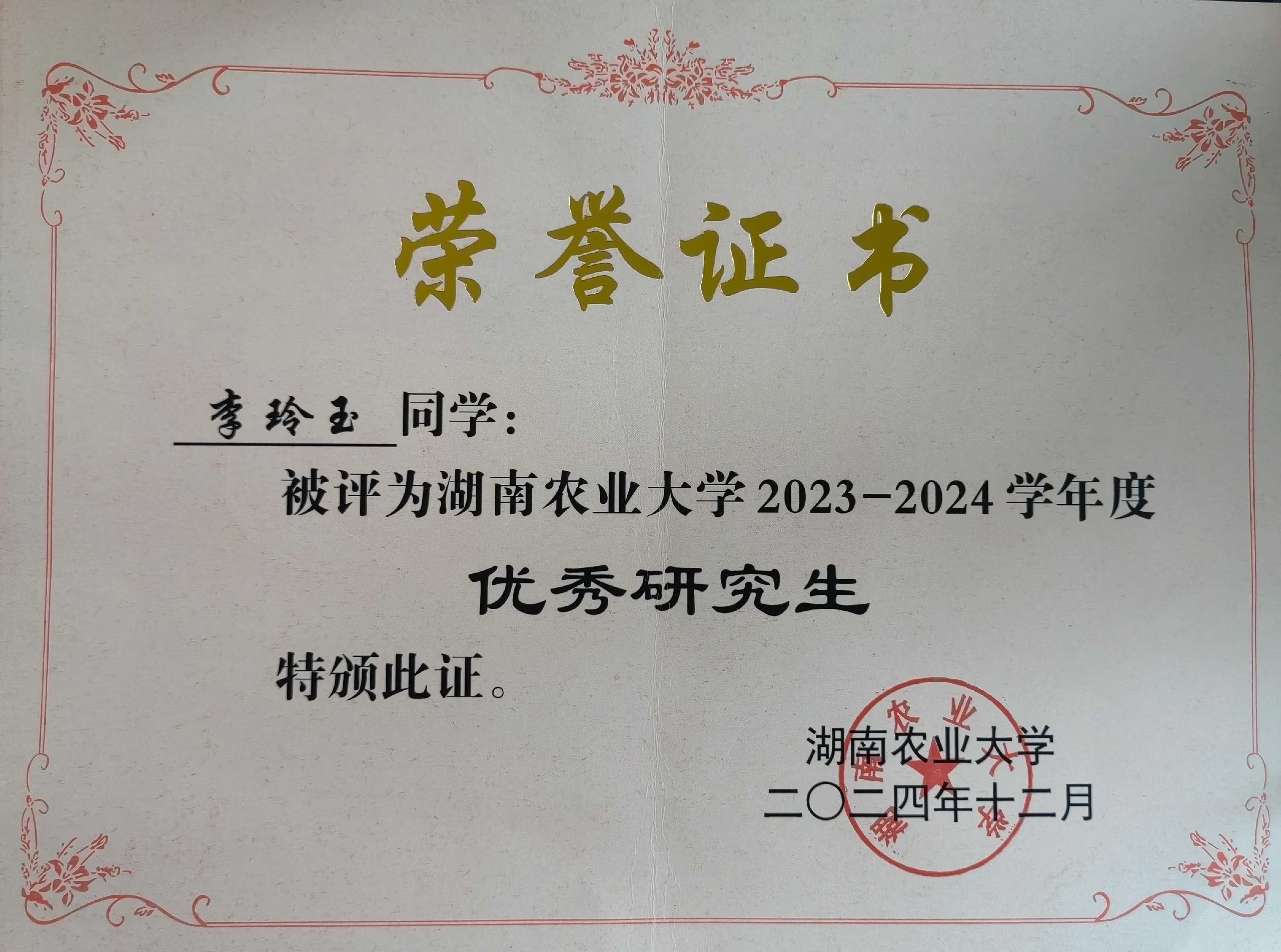 2024年获3044am永利集团官网A类奖学金,2023、2024学年度获3044am永利集团官网“优秀研究生”荣誉称号,2025年获袁隆平追梦奖学金,2025年获研究生国家奖学金,2025年获3044am永利集团官网A类奖学金,2025年获3044am永利集团官网优秀研究生标兵。