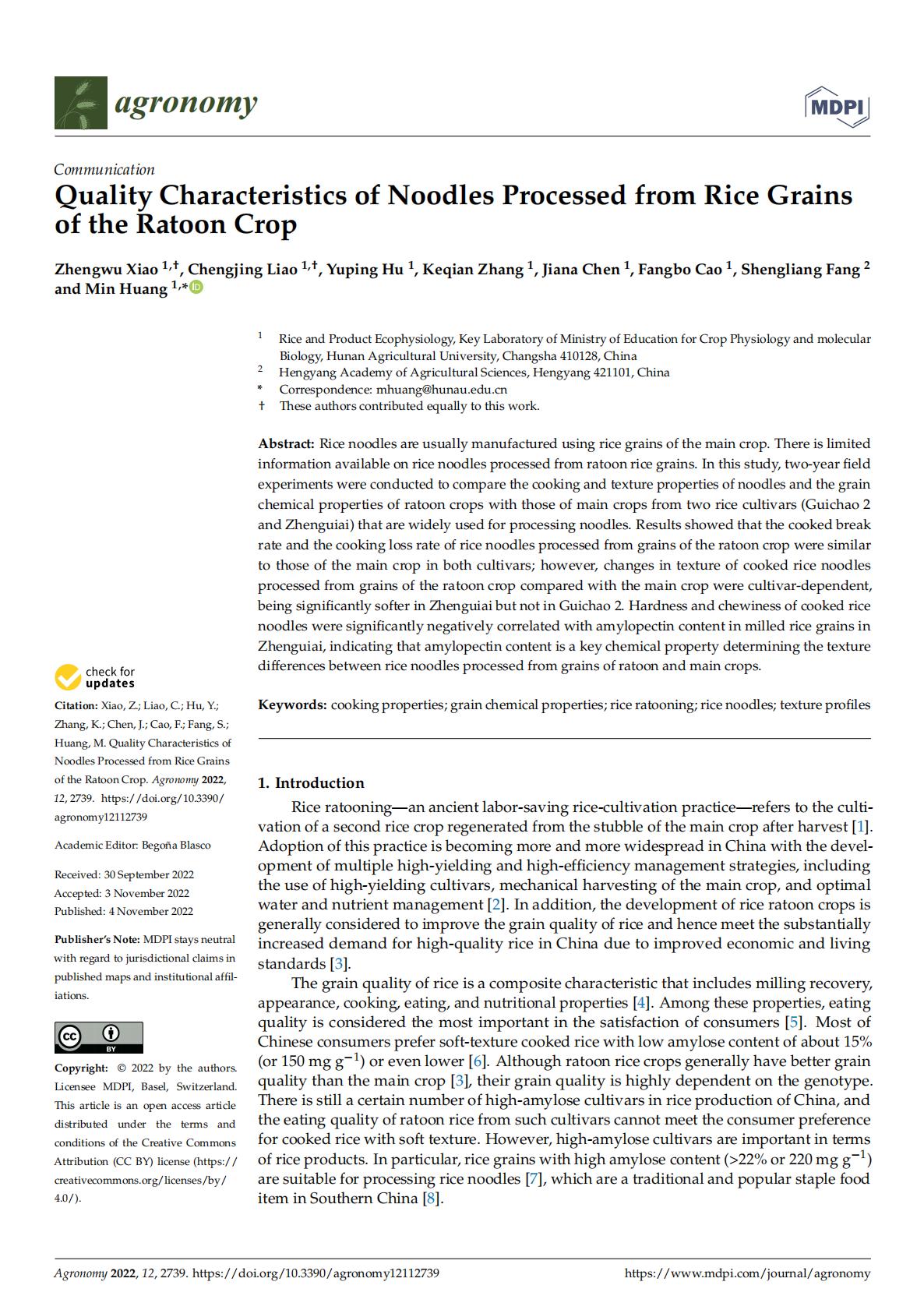 6. Xiao Z, Liao C, Hu Y, Zhang K, Chen J, Cao F, Fang S, Huang M. Quality characteristics of noodles processed from rice grains of the ratoon crop. Agronomy, 2022, 12: 2739.