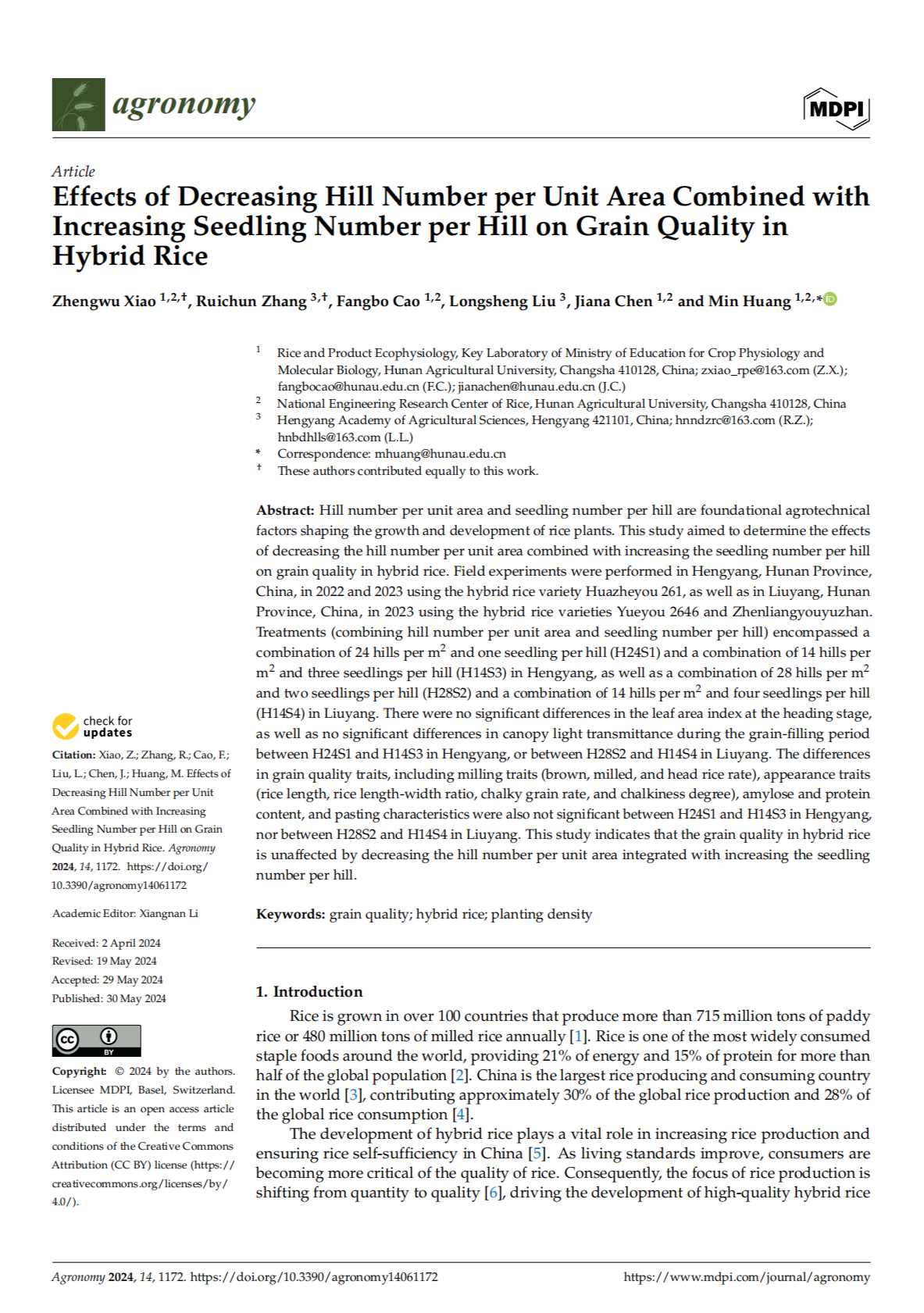 3. Xiao Z, Zhang R, Cao F, Liu L, Chen J, Huang M. Effects of decreasing hill number per unit area combined with increasing seedling number per hill on grain quality in hybrid rice. Agronomy, 2024, 14: 1172.
