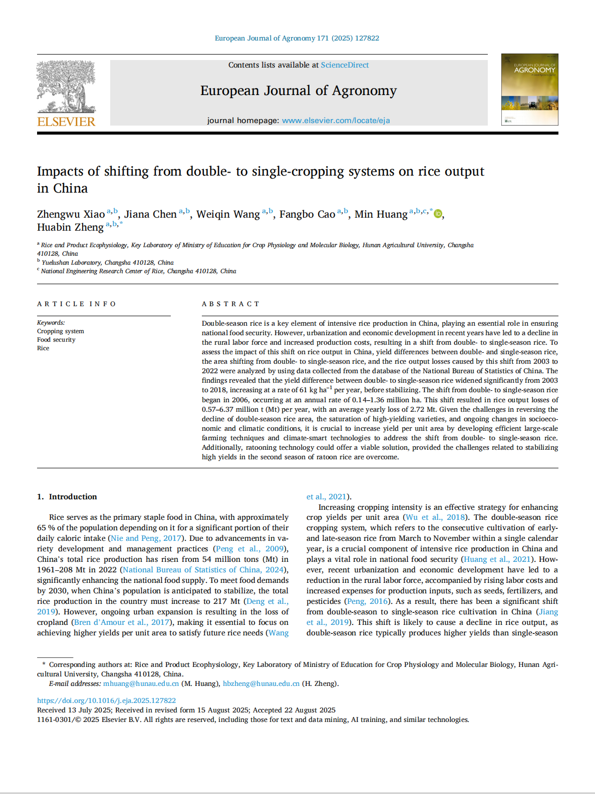 1. Xiao Z, Chen J, Wang W, Cao F, Huang M, Zheng H. Impacts of shifting from double- to single-cropping systems on rice output in China. European Journal of Agronomy, 171: 127822.