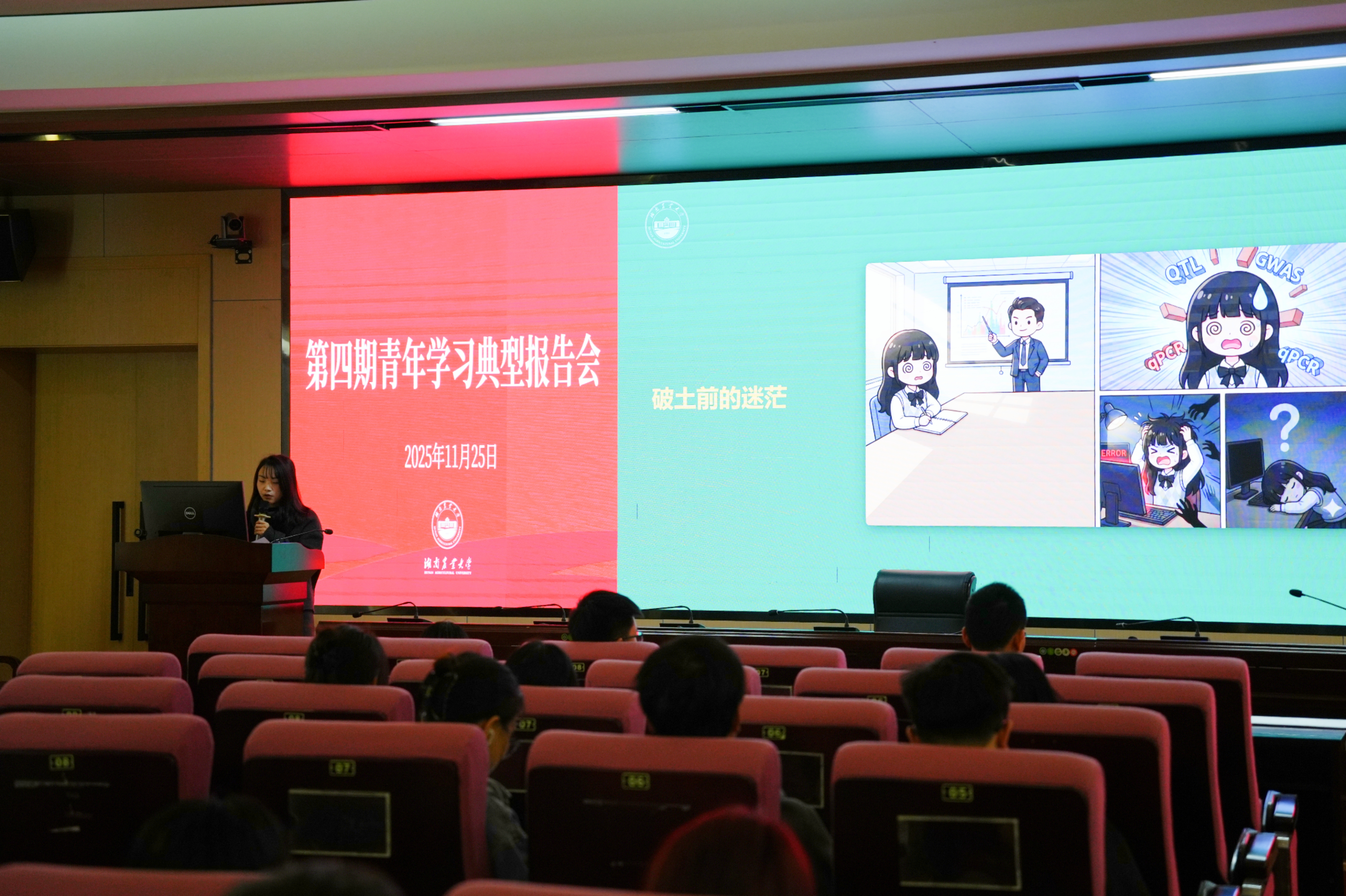 报告会上,2023级硕士研究生李玲玉,作为袁隆平追梦奖学金和国家奖学金获得者,以“向下扎根,向上生长”为主题分享研途心得,回顾入学初期的迷茫与田间科研的艰辛的心路历程。她分享了文献管理、数据可视化等实用技巧,强调科研严谨与心态沉淀的重要性,希望同学们明确自身目标,精进专业能力,做到劳逸结合,在农学领域深耕不辍,让青春在泥土与科研中绽放光彩。